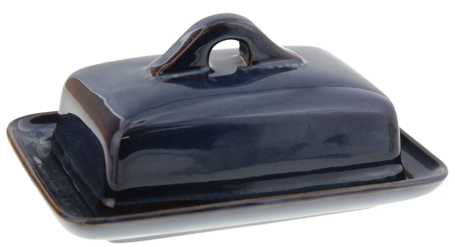 De rechthoekige botervloot van Oldenhof 1821 is gemaakt van blauw, geglazuurd aardewerk. De botervloot bestaat uit een lage schaal en een hoge deksel. Gebruik de botervloot om boter te bewaren en te serveren.